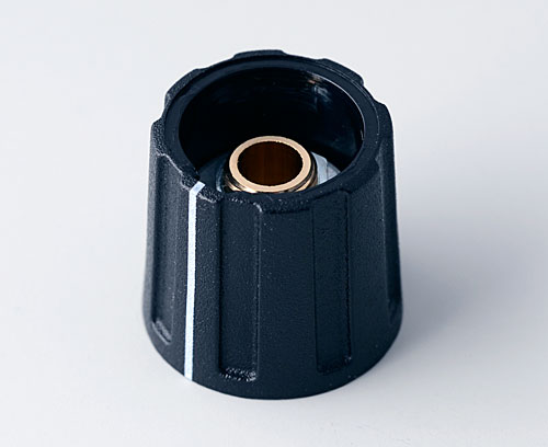 ROUND KNOB 16, with line Suitable for rotary potentiometer with round shaft ends according to DIN 41591. Collet system for convenient knob assembly from the front and simple adjustment (with adjustment key - sep. article). Center hole with chamfer. White marking.