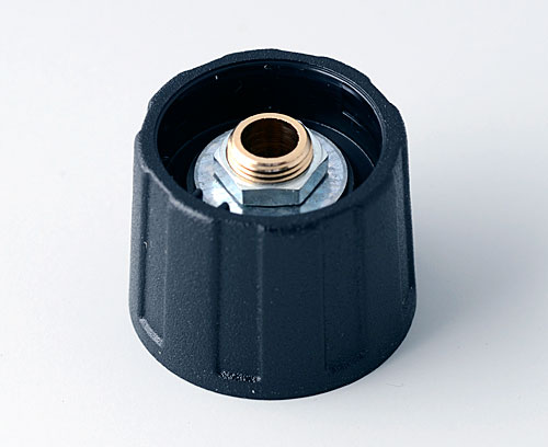 ROUND KNOB 20, with line Suitable for rotary potentiometer with round shaft ends according to DIN 41591. Collet system for convenient knob assembly from the front and simple adjustment (with adjustment key - sep. article). Center hole with chamfer. Black marking.