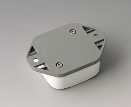 2-part plastic enclosure with high top part. Bottom part with integrated flanges for fast wall mounting or for mounting on rails and tube profiles or on masts. Robust design with proven tongue and groove connection. Assembled with Torx stainless steel screws. Fixing supports for PCBs and components in the top and bottom parts. Fastening on the supports is by means of hot caulking.