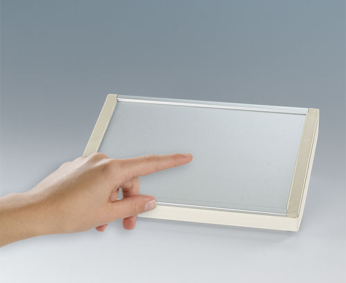 Cover SL, convex Suitable for DATEC-TERMINAL SL. For protecting the electronics. Recessed operating area (1 mm) for protecting the membrane keyboard. With screw pillars for PCB fixing. Cover strips in transparent or off-white necessary as separate article. Fixing from the front by 4 screws.