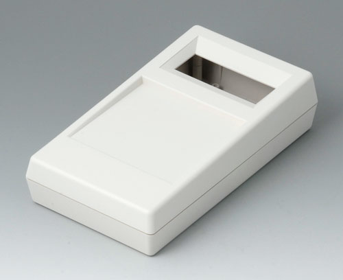 HAND-HELD-BOX M, Vers. I Small hand-held case with excellent design. With recessed area, e.g. for membrane keyboards, control elements. Cut-out section for digital and analogical modules. Battery compartment accessible from the outside with locked battery compartment lid. Raised front area to accommodate plugs.