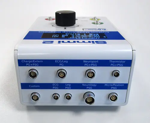 The device shown here is a biosignal simulator, which is used to calibrate and test sleep diagnostic equipment. For example, it is able to output an ECG signal or a sine wave to specific sockets.