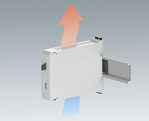 DIN rail enclosure with 2 pluggable side panels with ventilation slots for increased heat dissipation and front panel. Simple and quick assembly by locking onto DIN rails EN 60715 TH35. The panel version provides simple and flexible installation of the electronics as well as efficient, screwless case assembly.