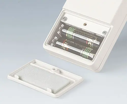DATEC-POCKET-BOX L Robustes Taschengehäuse ohne Dichtung. Vertieftes Bedienfeld für Folientastaturen. Schraubdome für Platinen in Ober- und Unterteil. Von außen zugängliches Batteriefach mit verschraubtem Batteriefachdeckel im Gehäuseunterteil. Batteriefach für 1 x 9 V-Flachbatterie (PP3) oder 2 x 1,5 V Mignon-Zellen (AA).