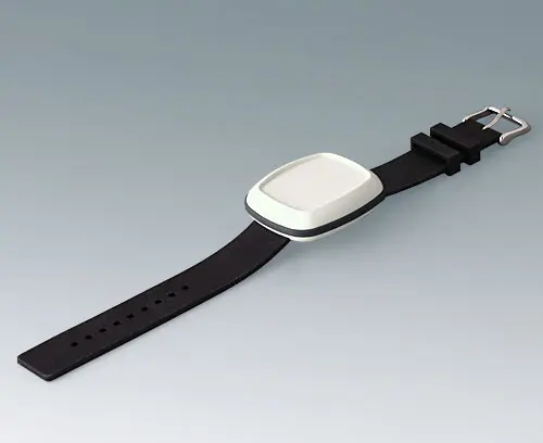 Modernes Gehäuse für kleine Gerätschaften im Bereich „Wearable Technologies“. Dreiteilige Konstruktion bestehend aus Ober- und Unterteil, hochglanzpoliert sowie einem TPV-Dichtring, matt. Vertieft liegende Fläche für Folientastatur oder Dekorfolie.