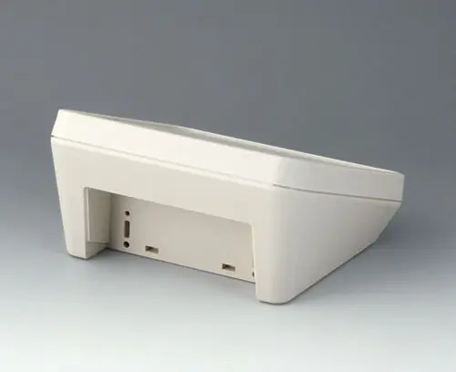 2-teiliges Kunststoffgehäuse in modernem Design mit einer ergonomisch geneigten Bedienfläche. Befestigungsdome für Platinen und Bauteile im Ober- und Unterteil. Zurückversetztes Schnittstellenareal. Wandhalter und Dichtung (zur Erhöhung der Schutzart bis IP 65) im Zubehörprogramm. Unsichtbare Verschraubung mit Edelstahlschrauben und Torx-Antrieb. Durch das hochwertige Material und die robuste Konstruktion auch im Außenbereich einsetzbar.