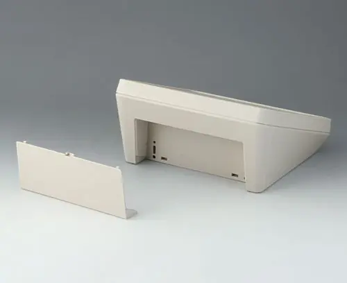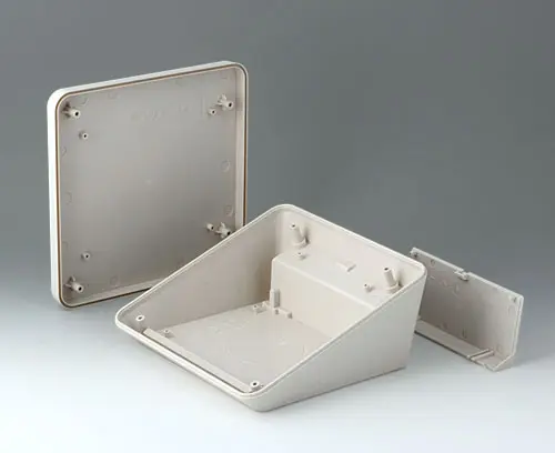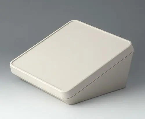 3-teiliges Kunststoffgehäuse in modernem Design mit einer ergonomisch geneigten Bedienfläche. Die im Lieferumfang enthaltene Abdeckung ermöglicht es, das Schnittstellenareal optisch zu schließen und weitere Elektronik in einem separaten Bereich zu montieren. Abdeckung rastet zum Unterteil. Befestigungsdome für Platinen und Bauteile im Ober- und Unterteil. Wandhalter und Dichtung (zur Erhöhung der Schutzart bis IP 65) im Zubehörprogramm. Unsichtbare Verschraubung mit Edelstahlschrauben und Torx-Antrieb. Durch das hochwertige Material und die robuste Konstruktion auch im Außenbereich einsetzbar.