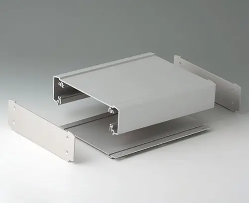 Robustes Gehäuse mit zweigeteiltem Aluminiumprofil (glasperl-gestrahlt und eloxiert) sowie Abschlussplatten aus Aluminium. Besonders gute Zugänglichkeit bei Montage- und Bestückungsarbeiten. Horizontale Leiterplatten-Führungen und Schraubkanäle im Gehäuse-Inneren. Plane Flächen für den einfachen Einbau der Schnittstellen. Vertieftes Bedienfeld zum Schutz von Displays, Folientastaturen und Bedienelementen.
