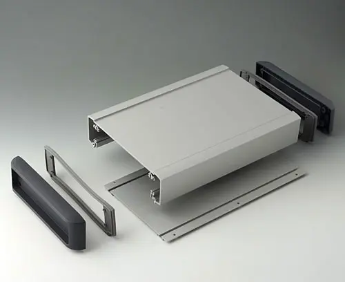 Horizontale Leiterplatten-Führungen und Schraubkanäle im Gehäuse-Inneren. Plane Flächen für den einfachen Einbau der Schnittstellen. Vertieftes Bedienfeld zum Schutz von Displays, Folientastaturen und Bedienelementen. Seitliche Abdeckkappen mit zurückversetztem Areal zum Schutz der Kabel und Stecker.