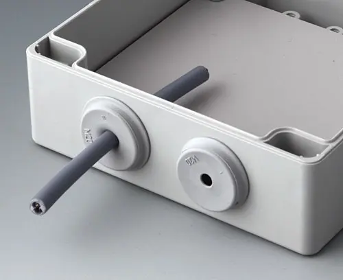 Simple cable grommet, easy to install, with easy-to-pierce membrane. Tight fit as soon as the cable is pulled backwards a little. Free of halogens. Suitable for wall thicknesses from 1 - 4 mm and for cable diameters from 8 - 13 mm. Operating temperatures from -40°C to +100°C. Borehole ø 20.5 mm.