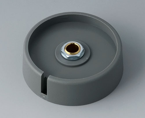 COM-KNOBS 20, with recess Suitable for rotary potentiometer with round shaft ends according to DIN 41591. Collet system for convenient knob assembly form the front. Borehole with chamfer.