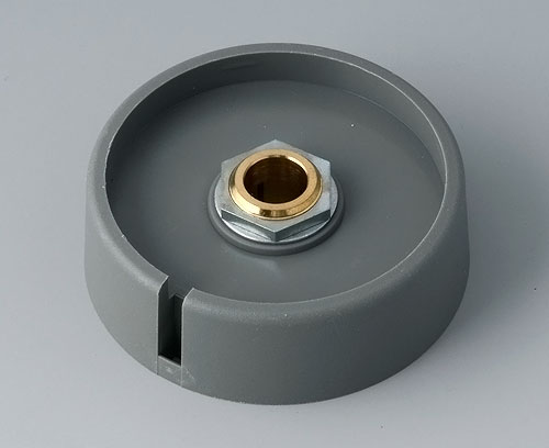 COM-KNOBS 20, with recess Suitable for rotary potentiometer with round shaft ends according to DIN 41591. Collet system for convenient knob assembly from the front. Borehole with chamfer.