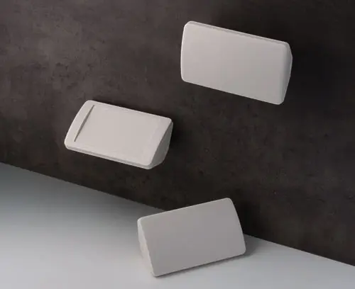 Two-part plastic enclosure with recessed panel to protect the membrane keypad / décor foil. The basic triangular shape allows it to be used in corners or at an ergonomically favourable angle of 45°. Robust design with proven tongue and groove assembly. Case assembled with Torx drive stainless steel screws. Protection class IP 40 without optional sealing kit. Fastening pillars for PCBs and components in the top and bottom parts.