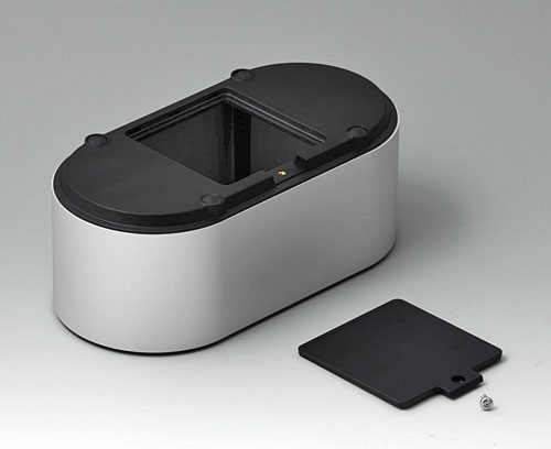 4-part enclosure for many different applications. Sturdy frame made of aluminium, glass bead-blasted and anodised. Plastic parts made of ASA+PC-FR with high UV protection and high flame resistance. Attachment domes for PCBs and components in the top and bottom parts. Top part with recessed surface to protect the membrane keyboard. Bottom part with opening and screw-down cover: practical for the use of a battery compartment or for access to the interior, e.g. for a memory card or batteries that are mounted directly on the PCB. Battery compartment kit 4 x AA with contact springs, battery clips, button cell holder and wall mounting option as accessories.