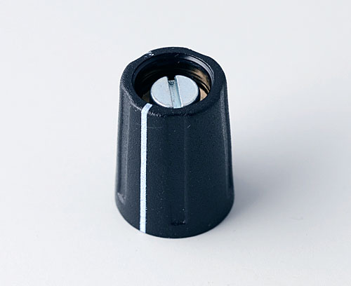 ROUND KNOB 9, with line Suitable for rotary potentiometer with round shaft ends according to DIN 41591. Collet system for convenient knob assembly from the front and simple adjustment (with adjustment key - sep. article). Center hole with chamfer. White marking.