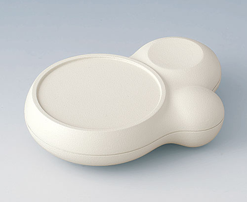 BLOB UNIT A genuine hand held enclosure that can be held and operated with one hand. Two-part enclosure design. Recessed surface for membrane keyboards. Attachment domes for a PCB in the top part.