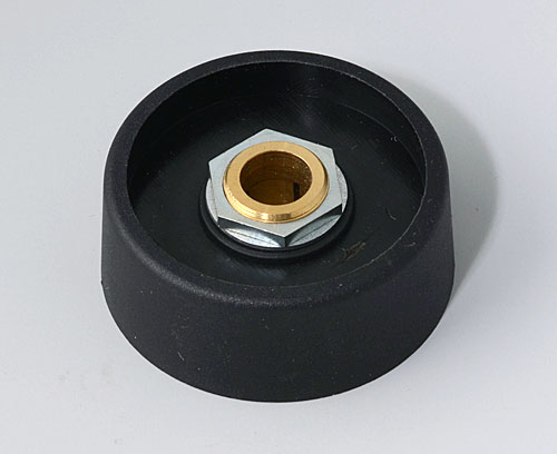 COM-KNOBS 40, with recess Suitable for rotary potentiometer with round shaft ends according to DIN 41591. Collet system for convenient knob assembly from the front. Borehole without chamfer.