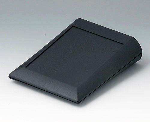 Two-part case in flat construction for table top and wall mounted applications. Ergonomically operating area sloped by 10°, 1.2 mm recessed for protecting membrane keyboards. Fixing towers in bottom and top part. Big area for interfaces at the top part's rear.
