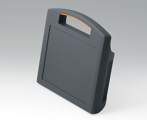CARRYTEC L Robust plastic enclosure with handle. Recessed surface for membrane keyboards. Flat, impact-protected areas on the bottom part of the enclosure for installing interfaces, plug-in connectors, peripheral equipment etc. Interface installation at the rear, e.g. support arm applications, ensures orderly cable routing through enclosure connection, mounting points match the hole patterns of VESA MIS-D 100. Attachment domes for PCBs and components in the top and bottom parts. Stations for easy transmission of data and charging current, as well as battery compartment 5 x AA (processing on request) as an accessory.