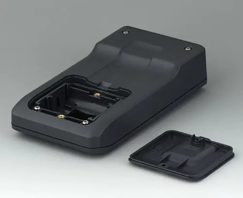 3-part compact hand-held enclosure with sealing and with an ergonomic, robust design. Ideal for miniaturised electronics applications. Secure grip through finger recess in the bottom part and centre of gravity near the body. With a battery compartment, accessible from the outside, for 3 x 1.5 V AA batteries. Recessed user area to protect the operating elements. Attachment domes for PCBs and components in the top and bottom parts.