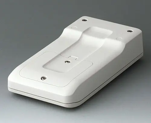 3-part compact hand-held enclosure with an ergonomic, robust design. Ideal for miniaturised electronics applications. Secure grip through finger recess in the bottom part and centre of gravity near the body. With a battery compartment, accessible from the outside, for 3 x 1.5 V AA batteries. Recessed user area to protect the operating elements. Attachment domes for PCBs and components in the top and bottom parts.