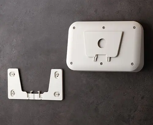 The adapter (106 x 75 mm) is attached to the bottom part of the enclosure by 4 screws. 4 boreholes ø 3.5 mm are required. The adapter makes it possible to clip the enclosure quickly and easily into the holder mounted on the wall. Optionally, the parts can be secured with 2 screws, thus offering additional protection against removal.