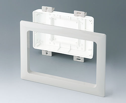 For the installation of the INTERFACE-TERMINAL enclosure in walls, in front panels, machines or systems. Can only be used in conjunction with bottom panel or open rear side of enclosure. Easy installation: Mount holders on the fully assembled enclosure. Place the enclosure with holders in the wall/front panel and align it. Mark and drill mounting holes. Then bolt the enclosure with the holders from the front and push on the design frame.
