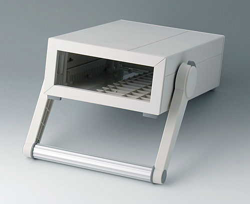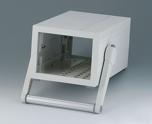 MEDITEC E 220, with handle bar Complete case. Ideally suited to accommodate single-Eurocards 100 x 220 mm or 100 x 160 mm. Two identical shells are joined together so that they overlap. Side trims easily fitted. Non-slipping case feet are fixed by screws to ensure a firm and stable support.