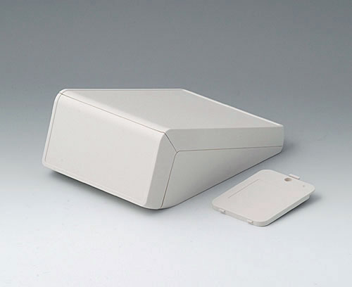 UNITEC M, 0.6/1.4 Plastic enclosure with two operating panels rectangular to each other, optionally for single or dual use. Front part recessed 0.6 mm. Top part recessed 1.4 mm. Fastening pillars for mounting of PCBs in top, base and front part.