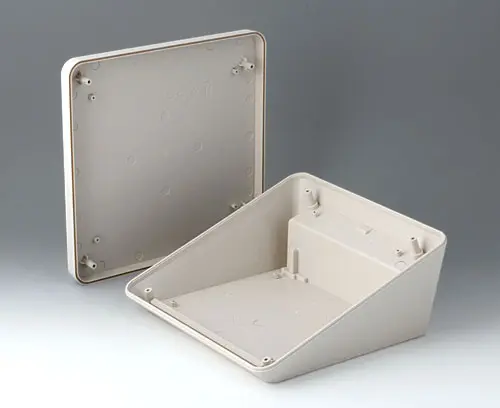 Modern two piece plastic enclosure with an ergonomically inclined operating panel. Fastening pillars for PCBs and components in the top and bottom parts. Recessed interface area. Wall suspension element and sealing (to raise the protection class up to IP 65) included in the range of accessories. Hidden stainless steel assembly screws with secure Torx heads. Can also be used outdoors thanks to the high-quality material and the robust design.