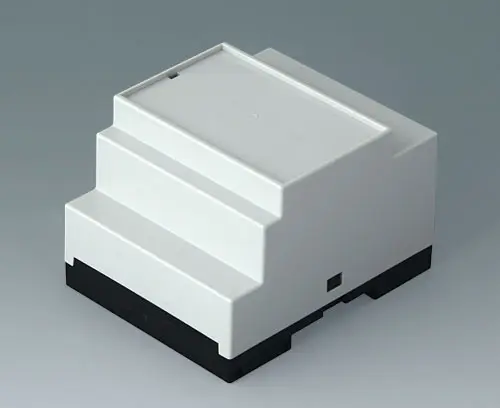 Enclosure for applications where larger components/assemblies need to be fitted inside. Different connection levels flat or high for individual configuration. Case corresponds to DIN 43880, size 1. Simple and quick assembly by locking onto DIN-rails EN 60715 TH35. Base part with fixing pillars for the PCB. Vertical and horizontal guides for additional PCBs.