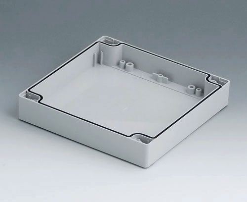 ROBUST-BOX WIDTH 240, Vers. I Robust plastic enclosure, ideal for electrical and electronic applications. Case shells either usable as top or base part. Each case part contains threads and fixing towers. Screw fixing outside of the sealing area. Recess of approx. 0.8 mm for use of membrane keyboards.