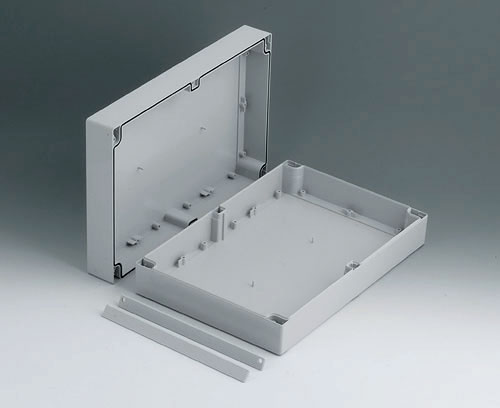 SMART-BOX WIDTH 170 Four-part plastic enclosure, ideal for design orientated electrical and electronic applications. The sealing is already prefitted in the top. Screw fixing outside of the sealing area. Resessed operating area to protect the membrane keyboard. Fastening pillars for PCBs and DIN-rails.