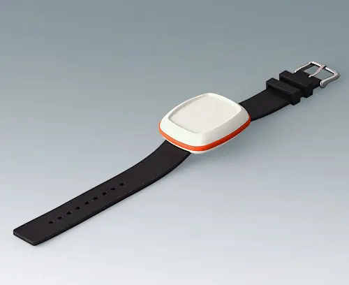 Boitier moderne pour les petits appareils du domaine des technologies portables. Conception en trois parties dont la partie supérieure et la partie inférieure en poli brillant et un joint en TPV mat. Surface en creux pour clavier à membrane ou feuille décorative.