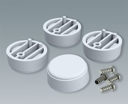 Pieds du boitier, Vers. II Pieds de boitiers universels utilisables pour boitiers en matière plastique ou en métal à l'épaisseur maximale de paroi de 3 mm. Le pieds basculable permet de donner à l'appareil une position inclinée. Il s'encliquette sur le pied de l'élément et peut être replié.