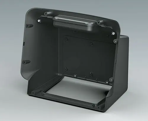 Face avant S À commander avec le corps du boitier COMMUNITEC S. Comprend une zone en retrait pour la protection des claviers à membrane et l'intégration d'écrans grand format jusqu'à 11,5" (29 cm), ainsi qu'une surface plane en partie basse pour les éléments de commande et les connecteurs. Des plots de fixation sont intégrés pour les PCB ou les platines de montage. Montage de la face avant par l’arrière.