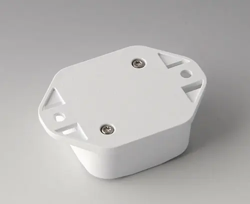 Boitier en plastique en 2 parties avec partie supérieure haute. Partie inférieure avec bride intégrée pour un montage mural rapide ou pour la fixation sur des rails et des profilés tubulaires ou sur un mât. Construction robuste avec assemblage éprouvé à rainure et languette. Vissage avec vis en acier inoxydable et entraînement Torx. Socle de fixation pour les circuits imprimés et les composants dans la partie supérieure et inférieure. La fixation sur les socles se fait par sertissage à chaud.