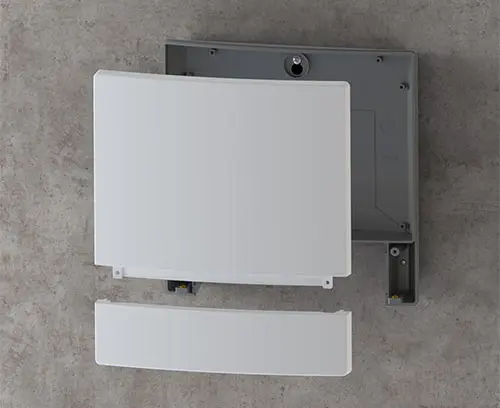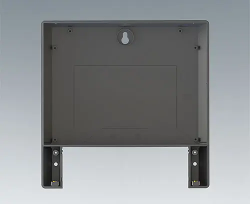 Partie inférieure avec ouvertures pour une fixation dissimulée au mur en trois points : 1 trou de serrure pour suspension au centre ainsi que 2 alésages pour sécuriser le boitier en bas à droite et à gauche.