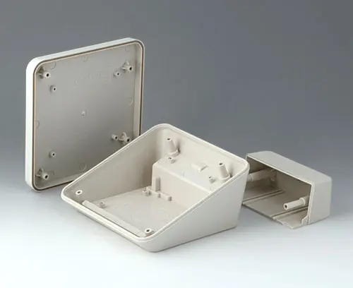 Boitier en matière plastique à trois éléments, au design moderne et avec une inclinaison ergonomique de la surface de visualisation et de commande. Le couvercle compris dans la fourniture permet d’agrandir le volume d’installation dans un espace à part. Bossages de fixation pour les circuits imprimés et composants dans les parties supérieure et inférieure. Support mural et joint (pour accroître le degré de protection jusqu’à IP 65) dans la gamme des accessoires. Visseries avec vis inox et entrainement Torx dissimulées. Également utilisable en extérieur grâce au matériel haut de gamme et la construction robuste.