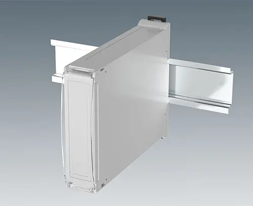 RAILTEC BP, M22, panneau latéral fermé et panneau latéral avec aération Boitier pour rail DIN avec un panneau latéral fermé, un panneau latéral avec aération et face avant clipsables. Connexions possibles sur 3 côtés. Pour des borniers fixes ou enfichables : 2 x 16 broches, pas de 5,08 mm. Montage simple et rapide sur rails DIN EN 60715 TH35. Ce nouveau modèle sans vis facilite l’intégration des composants électroniques et l'assemblage.