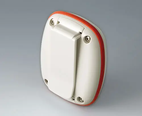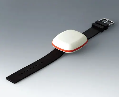 Modern small enclosure specifically designed for "wearable technologies". Three-part design consisting of highly polished top and bottom parts and a matt TPV sealing ring.