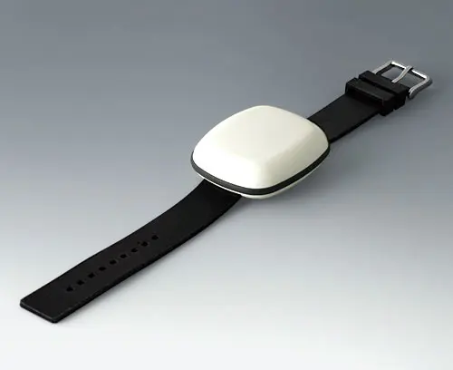 Modern small enclosure specifically designed for "wearable technologies". Three-part design consisting of highly polished top and bottom parts and a matt TPV sealing ring.