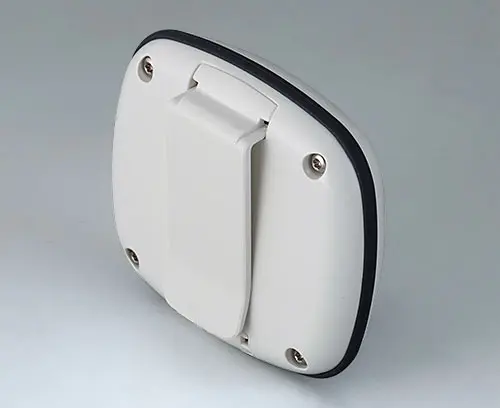 Modern small enclosure specifically designed for "wearable technologies". Three-part design consisting of highly polished top and bottom parts and a matt TPV sealing ring.