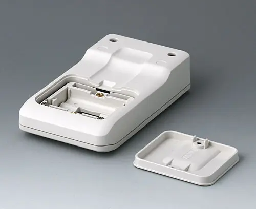3-part compact hand-held enclosure with sealing and with an ergonomic, robust design. Ideal for miniaturised electronics applications. Secure grip through finger recess in the bottom part and centre of gravity near the body. With a battery compartment, accessible from the outside, for 3 x 1.5 V AAA batteries. Recessed user area to protect the operating elements. Attachment domes for PCBs and components in the top and bottom parts.