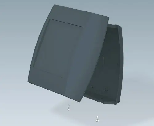 Two-part case. The bottom part can be fixed directly to the wall, the top part is fixed by Torx T10 stainless steel screws from above or below. Recessed operating area to protect the membrane keyboard. Fastening pillars for PCB in the bottom and top parts. Integrated battery compartment for 2 x AA.