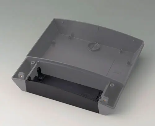 NET-BOX 180, Vers. I Three-part enclosure with a uniform appearance thanks to concealed screw connections. Modern colour combination of light grey and lava. 2 PCB levels with 4 attachment domes each in the electronics compartment. Can also be used out of doors thanks to the high-quality ASA+PC-FR material.