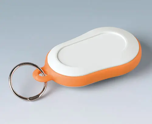 SMART-CASE XS Miniature case composed of 2 parts with eyelet hole for a keyring. Possibilities for fixing PCBs in base part. Assembly of top and base part by screwing. Space for a 12 V round cell and small round cells.