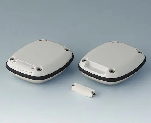 Modern small enclosure specifically designed for "wearable technologies". Three-part design consisting of highly polished top and bottom parts and a matt TPV sealing ring.