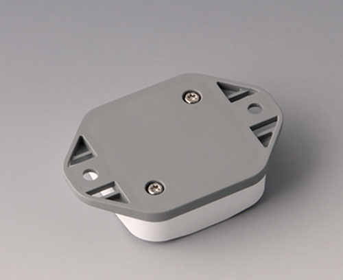 2-part plastic enclosure with flat top part. Bottom part with integrated flanges for fast wall mounting or for mounting on rails and tube profiles or on masts. Robust design with proven tongue and groove connection. Assembled with Torx stainless steel screws. Fixing supports for PCBs and components in the top and bottom parts. Fastening on the supports is by means of hot caulking.