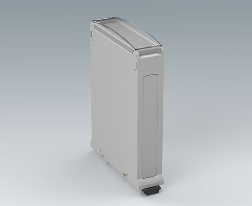 RAILTEC BP, M22, with closed side panels DIN rail enclosure with pluggable side panels and front panel. Connection options on three sides. For plug headers max. 2 x 16-pin, 5.08, fixed or pluggable. Simple and quick assembly by locking onto DIN rails EN 60715 TH35. The panel version provides simple and flexible installation of the electronics as well as efficient, screwless case assembly.